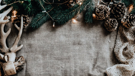 A rustic Christmas background featuring a deer skull with antlers, pinecones, fir branches, and fairy lights on a textured wooden surface.