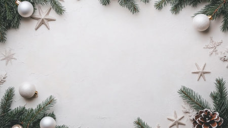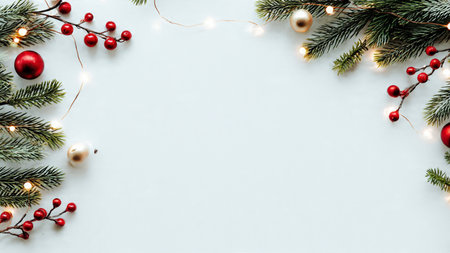 Elegant minimalist Christmas background with pine decorations and fairy lights.