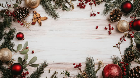 Bright and balanced Christmas frame featuring deep green foliage and glittering decorations.