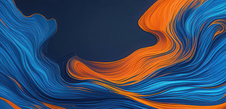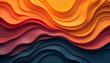 A vibrant abstract illustration featuring layered wavy shapes in shades of orange and blue