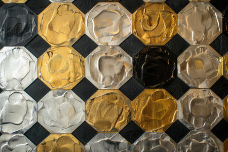 This composition showcases a series of interlocking geometric forms that display a captivating metallic texture. The intricate shapes catch ambient light, creating a dynamic interplay of reflections and shadows. The overall effect evokes a sense of depth and dimension, drawing the viewer into a visually stimulating arrangement.