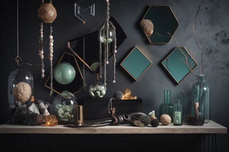 This captivating arrangement features an array of geometric wooden decorative objects alongside a natural plant element, showcasing a serene and stylish interior design aesthetic.