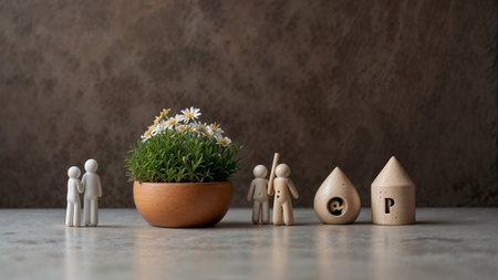 Miniature people standing next to a clay pot with a flower and a wooden pencil