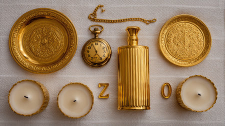 A still life arrangement of golden objects including a pocket watch, perfume bottle, coasters, and candles.