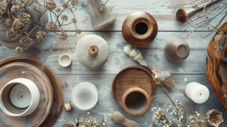 A top view of wooden and ceramic pottery arranged on a rustic wooden table, with dried flowers and natural materials creating a warm and artisanal aesthetic.