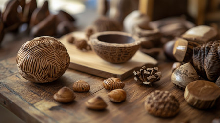 A collection of wooden and ceramic decorative items arranged on a wooden surface, showcasing a rustic and artistic aesthetic. Ideal for themes of home decor, craftsmanship, and natural materials.