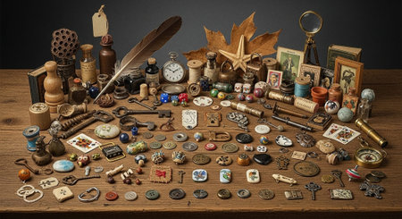 A flat lay of a vintage collection of antique objects and artifacts arranged on a wooden surface. Suitable for historical and antique themes.