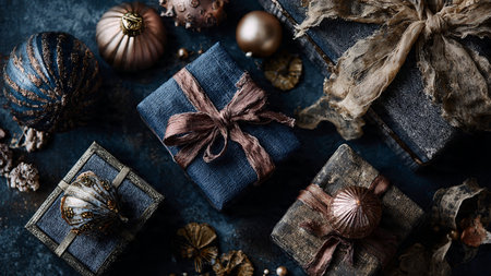 Elegant deep-blue ribbons paired with glowing rose-gold accents in a premium festive scene.
