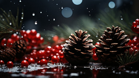 Christmas decoration on dark wooden background. Pine cones, branches and berries.