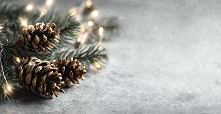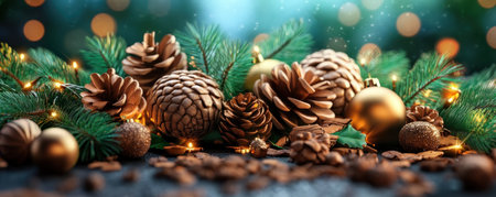 Festive new year background with pinecones and evergreen foliage for seasonal designs
