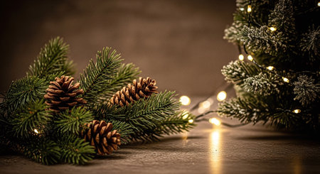 A close-up captures a decorated Christmas tree with pine cones and small lights. The composition is set against a soft, blurred background, highlighting the texture and details of the natural elements. This image is suitable for festive season content, editorial illustrations, and commercial design purposes.