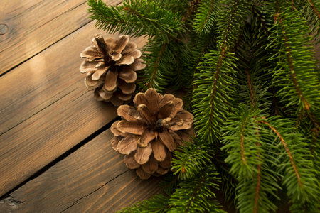 A beautifully arranged composition featuring pine cones and evergreen branches on a wooden surface, ideal for evoking a warm and cozy holiday feeling.