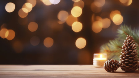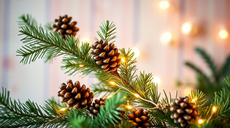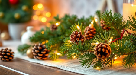 Pine branches with pinecones are artfully arranged, surrounded by warm, blurred lights creating a cozy holiday atmosphere.