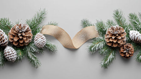 A stunning display of frosted pinecones and lush greenery enhanced by a shimmering gold ribbon, perfect for Christmas decorations and holiday arrangements.