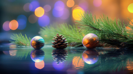 A close-up of a pine branch with a pinecone and red Christmas ornaments, surrounded by glowing bokeh lights, capturing the festive holiday spirit.