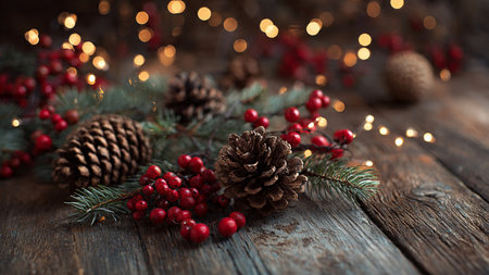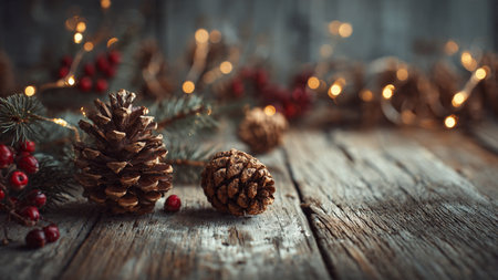 Capture the magic of the holidays with this still life Shimmering tinsel garlands drape elegantly over rustic wood, adorned with pinecones and evergreens Bokeh lights create a warm, inviting glow, perfect for cards and festive designs, evoking a cozy Christmas or winter scene AI Generative