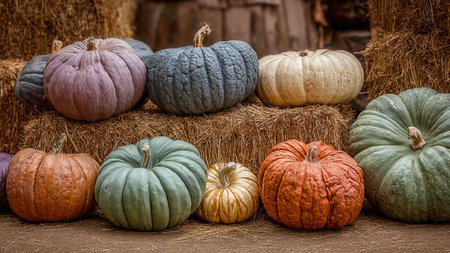 A vibrant display of multicolored pumpkins arranged on hay bales in a rustic autumnal setting, evoking a sense of harvest and seasonal celebration.