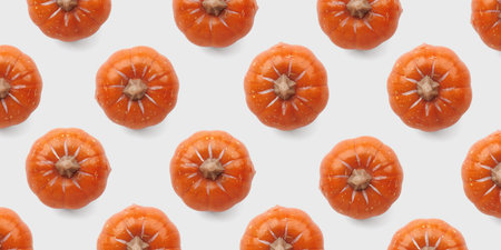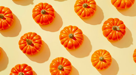 Pattern with many orange pumpkins on light yellow background, top view, minimal flat lay style.