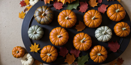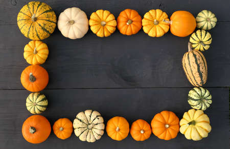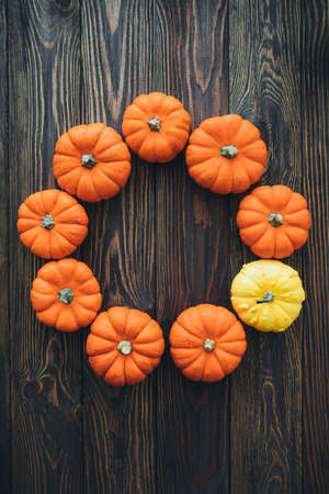 From above view of various kinds cute mini pumpkins placed in circle with copy space