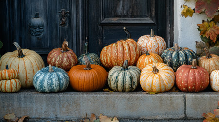 Clusters of vibrant pumpkins and gourds resting on lush grass in front of a dark wooden wall, creating a charming and festive atmosphere perfect for autumn and Halloween celebrations