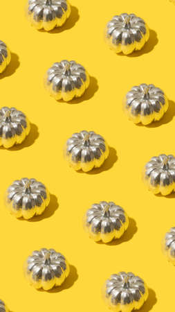 Trendy pattern with silver pumpkin on bright yellow background. Futuristic fall holiday concept. Vertical crop.