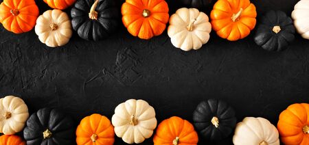 Fall top border of pumpkins of various sizes and colors over a rustic dark wood banner background. Overhead view with copy space.