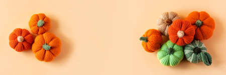 Knitted orange and green pumpkins on an orange background, autumn composition, banner. Halloween concept.