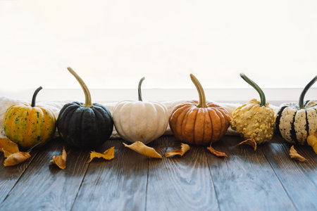 Autumn composition of miniature decorative pumpkins on a wooden table.