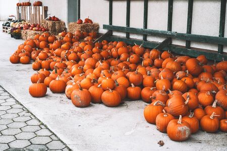Autumn harvest of pumpkins. Background of different varieties of winter squashes. Pile of orange pumpkins at farm market or seasonal festival.