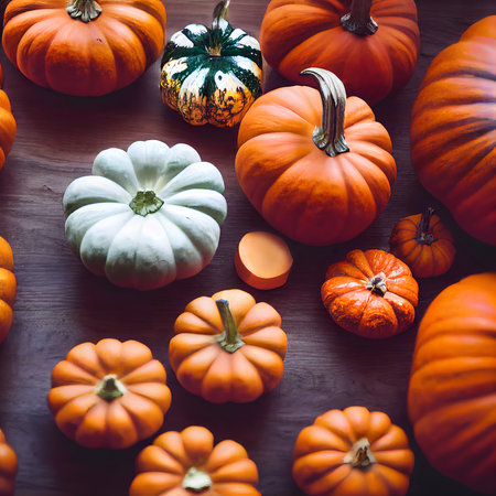 Bright orange and white miniature pumpkins and decorative gourds creating a rustic flat lay arrangement, symbolizing the cozy fall season and celebrating Halloween and Thanksgiving