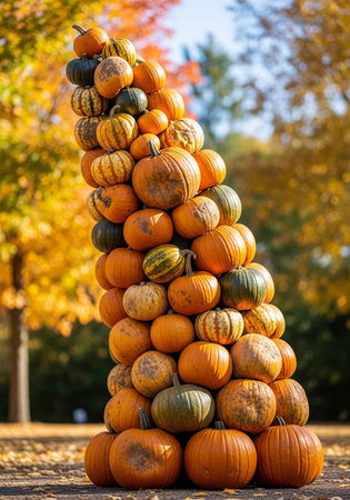A tall stack of pumpkins in an autumnal outdoor setting with trees