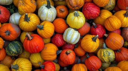 Autumn harvest colorful pumpkins and squashes in different varieties at farm market or seasonal festival. Background of decorative fall and winter squashes