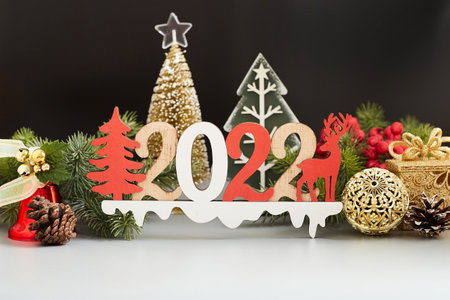 2022 decorative figures of the new year and Christmas, golden candles on a red background. frame of spruce branches. banner, Christmas card,