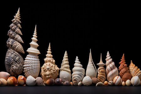 A collection of seashells arranged in a pattern on a black background, emphasizing their unique shapes and textures.