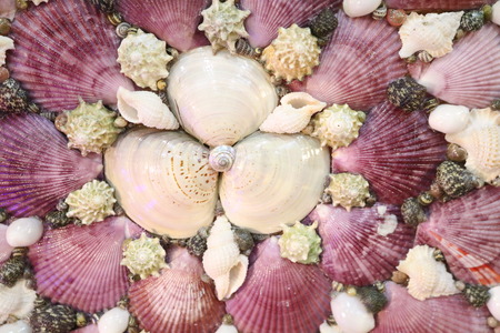 Mixed colorful sea shells as background. Sea shells macro view. Sea shells close up