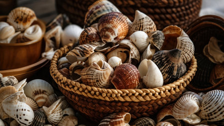 AI Generated. Colorful Collection of Seashells in a Woven Basket