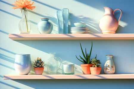 A beautifully arranged collection of artisan ceramics and unique pottery displayed on wooden shelves, creating a warm and inviting atmosphere in home decor.
