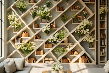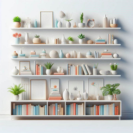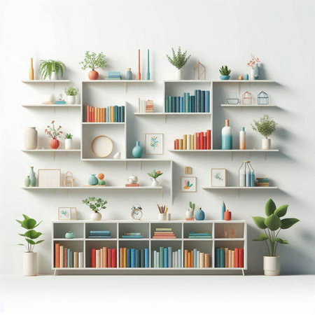A stylish arrangement featuring art, books, and plants that brings warmth to any space. Embrace modern aesthetics with this design. Generated A.I.