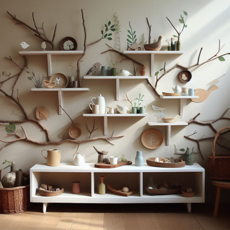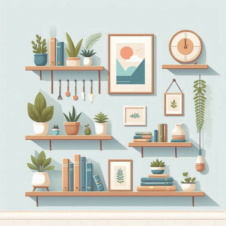 Botanical wall decor with greenery in pots on wooden shelves to enhance home and office spaces