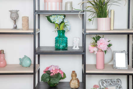 Flowers and decorative decorations on a metal rack in the style of minimalism in the living room in a Scandinavian style