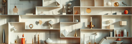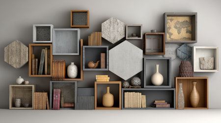 A cubic shelving unit housing various geometric knickknacks and trinkets