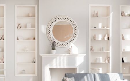 White shelves with books and decorations in scandinavian style. 3d rendering