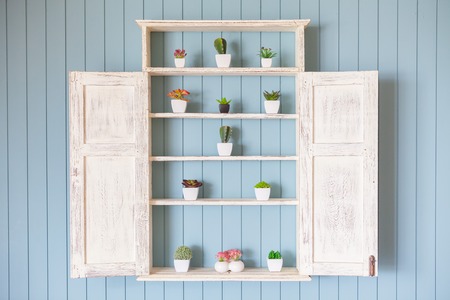 Decoration elements shelf in vintage cafe with flower pot , cereal bottle and agricultural equipment
