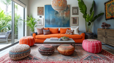 Vibrant, patterned poufs bring a pop of color and texture to this eclectic living space.
