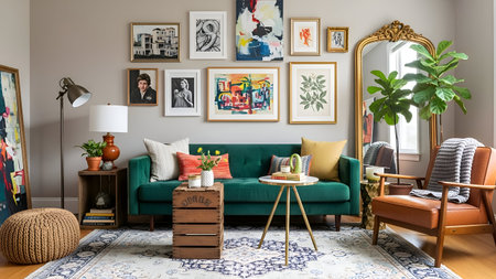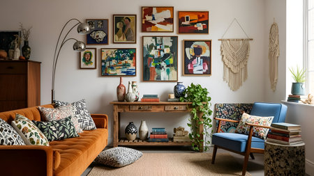 This artistic interior showcases a curated collection of framed art, plants, and decorative elements, blending style and comfort. A feast for the eyes, this scene is inspired by modern aesthetics. Generated A.I.