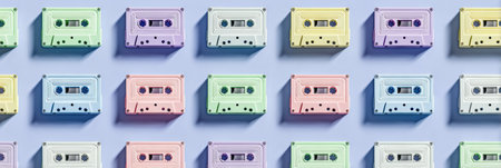 Collection of Retro cassette tapes of vibrant hues. Top view. Background. Concept of vintage music, collectible items, the 80s and 90s culture, and the charm of physical media. Banner