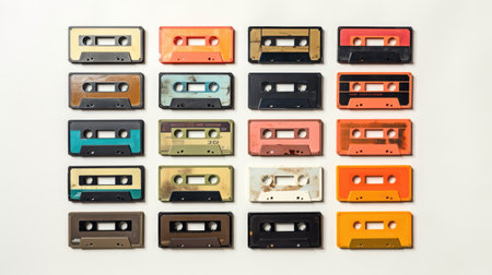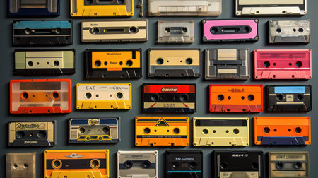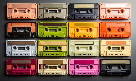 Retro cassette tapes in an array of vivid hues. Top view. Backdrop. Concept of vintage music, collectible items, the 80s and 90s culture, and the charm of physical media.