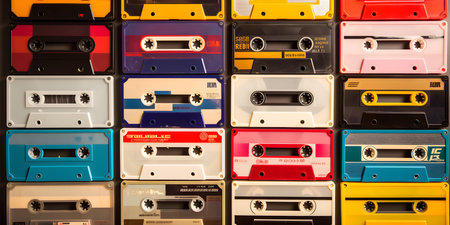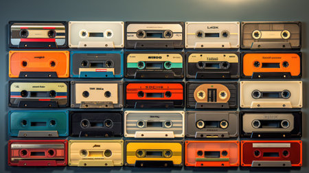 Colorful old fashioned audio cassette tapes creating a repeating pattern, symbolizing vintage music, retro technology, and nostalgic memories of the 1980s and 1990s era