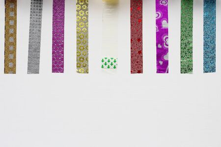 colored scotch tape, Accessories for packaging on white background,copy space, closeup, flat lay,
