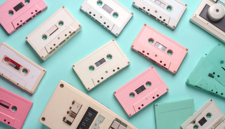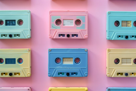 Pastel-colored audio cassettes arranged on a pink and teal background, showcasing a variety of designs and angles